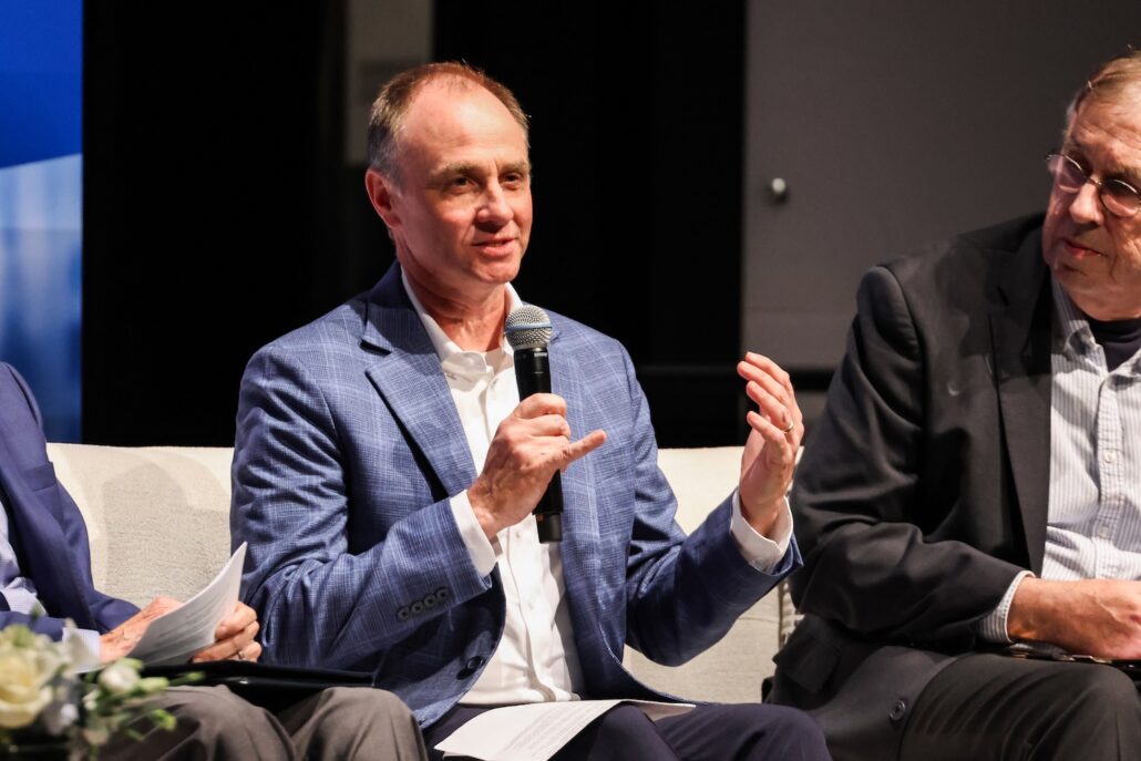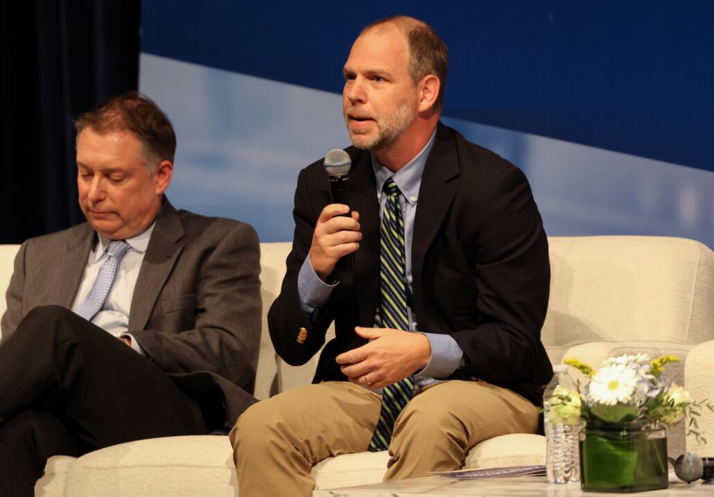 Senior Vice President of Global Manufacturing at First Solar Mike Koralewski speaks during The Blade’s Perspectives series: “Tariffs and Trade in the Modern Age” at the University of Toledo’s Doermann Theatre in downtown Toledo on Wednesday, June 11, 2025.