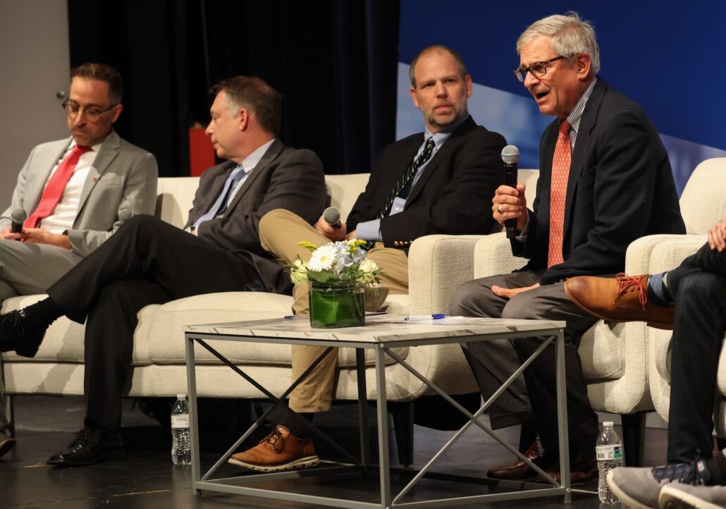 David Shribman, Pulitzer Prize-winner, national syndicated columnist and executive editor emeritus of the Pittsburgh Post-Gazette, right, moderates the panel during The Blade’s Perspectives panel discussion on the role of AI in our lives at the University of Toledo’s Doermann Theatre in Toledo on Wednesday, Oct. 15, 2025.